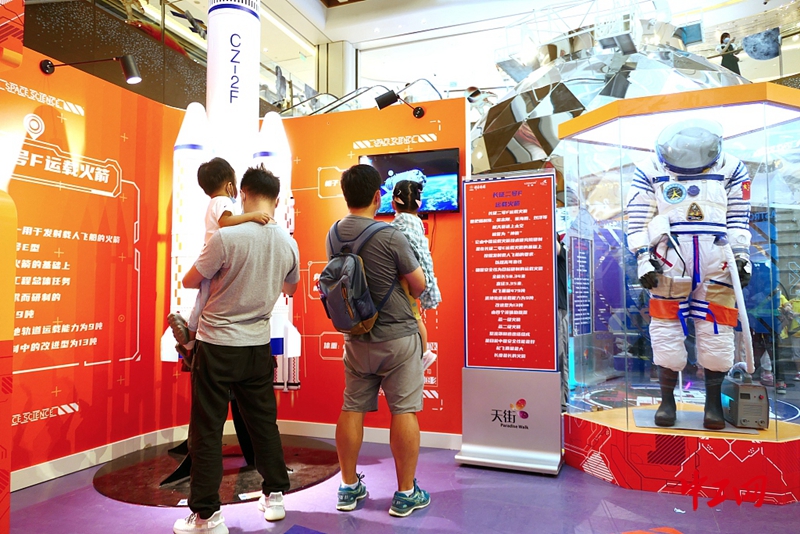 2020年9月13日,北京,“星河游记——中国航天2020科普互动展”吸引小朋友前往体验。“星河游记——中国航天2020科普互动展” 9月12日在长楹天街开幕。展览通过五大场景回顾中国航天的重大事件,让沉浸式体验中的人们,感受中国航天科技的辉煌成就。展览充分利用科技感十足的VR、裸眼3D、球幕电影等技术,为全国首次展出,持续至10月25日。