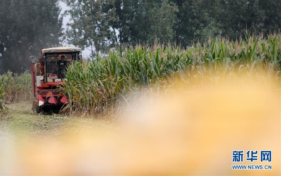9月14日,收割机在山东省临沂市郯城县郯城街道三井村田间收获玉米。 金秋时节,玉米丰收,各地农民抢抓晴好天气忙碌在田间地头。 新华社发(张春雷 摄)