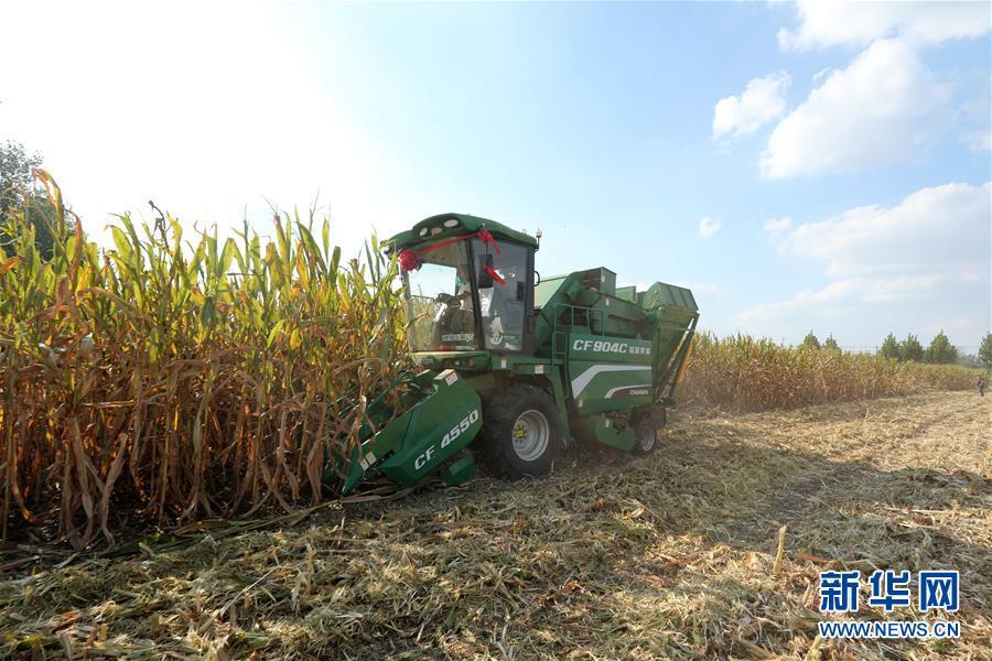 9月12日,收割机在安徽省亳州市蒙城县乐土镇李大寨村玉米田收获玉米。 金秋时节,玉米丰收,各地农民抢抓晴好天气忙碌在田间地头。 新华社发(胡卫国 摄)