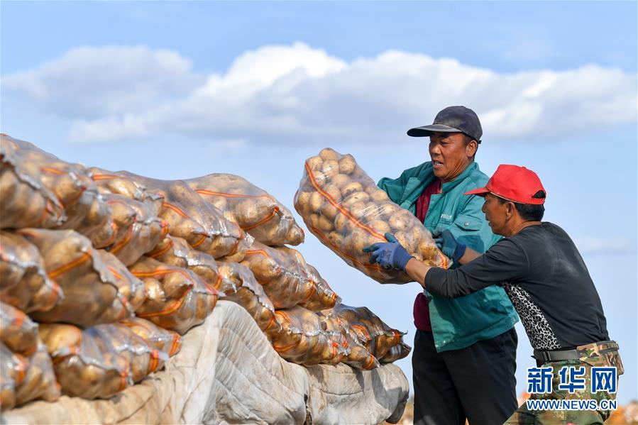 9月14日,农民在搬运收获的土豆。 秋收时节,在内蒙古自治区呼和浩特市武川县上秃亥乡厂汉木台村的农田里,农民忙着收获土豆,一片热闹景象。 新华社记者 贝赫 摄