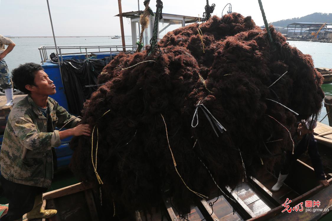 2020年9月14日,在山东省荣成市爱伦湾一养殖码头,养殖工人正在吊运江蓠。江蓠又称龙须菜,当地渔民利用海上作物生长规律巧打"时间差",在海带收割的间歇期,在收获完的海带养殖架上养殖江蓠,提高海上养殖的产出效益,增加收入。(李洪明摄/光明图片)
