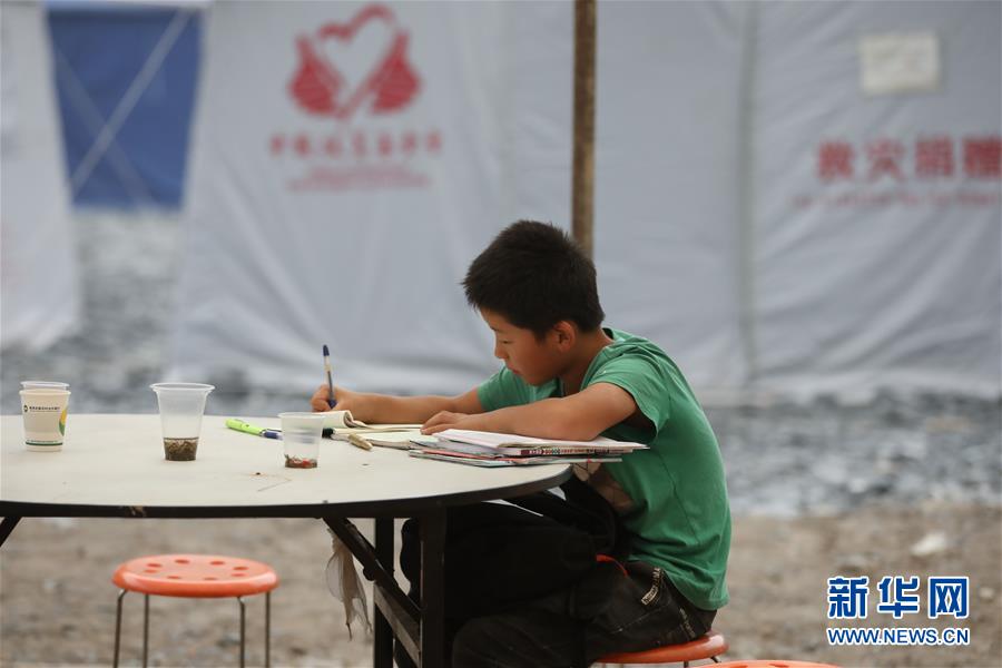 9月15日,陇南市武都区外纳镇桃园坝安置点的一名学生在写作业。新华社记者 马希平 摄