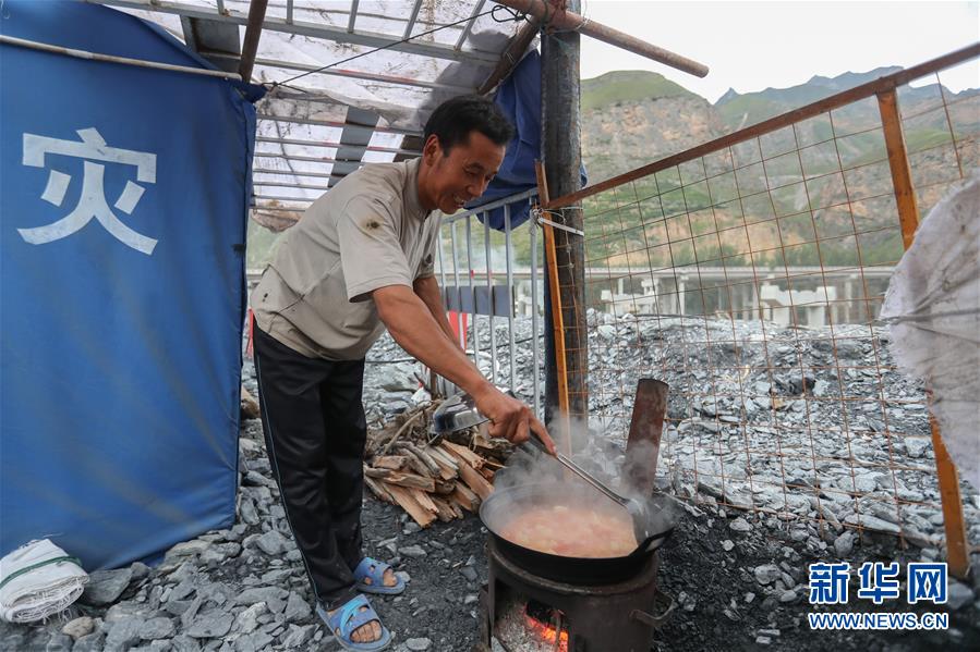 9月15日,陇南市武都区外纳镇桃园坝安置点的群众在帐篷外做晚饭。 新华社记者 马希平 摄