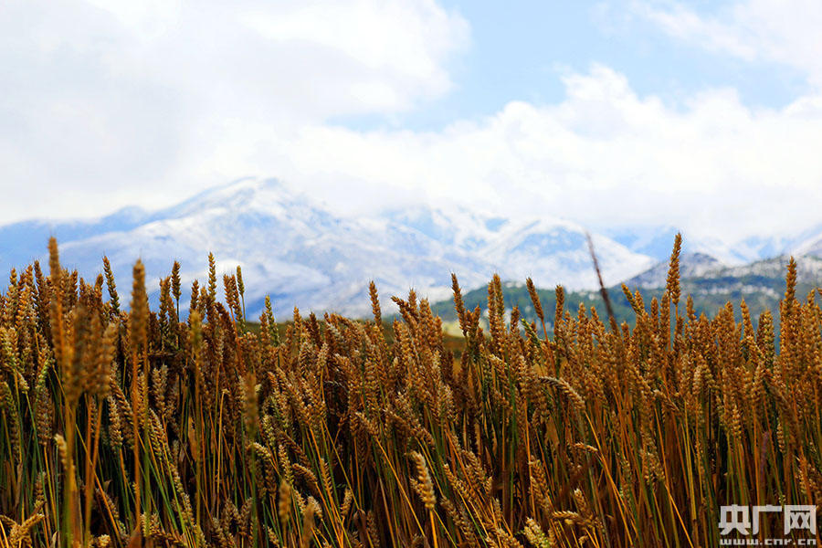 央广网西宁9月17日消息(记者葛修远 通讯员樊永涛)金秋时节,青海省西宁市大通回族土族自治县逊让乡八里村的梯田里,金黄色的麦穗在雪山的映衬下,分外灿烂。