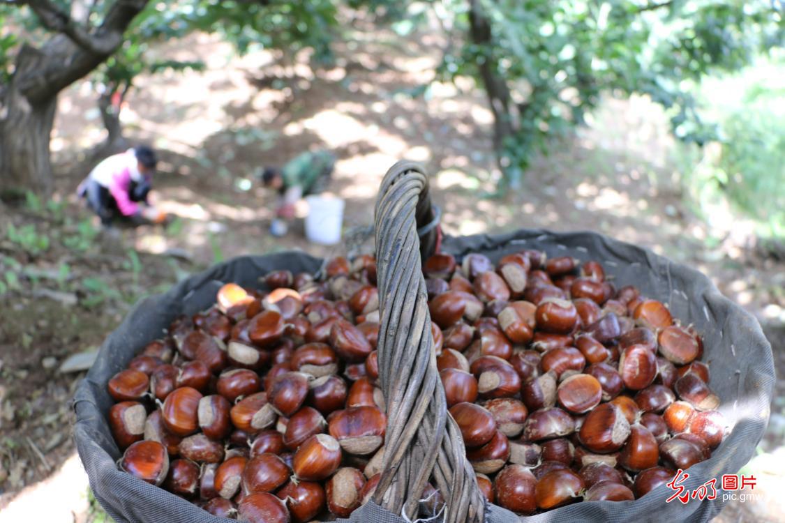近日,位于河北北部、燕山腹地的宽城满族自治县迎来板栗收获上市时节,当地农民和板栗加工企业忙着采收、收购板栗,供应市场。(刘环宇摄/光明图片)