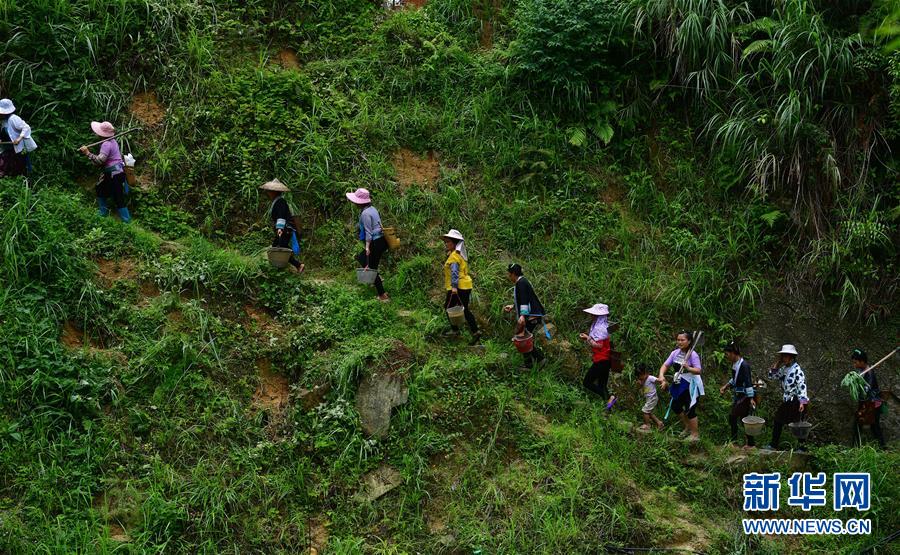 乌英苗寨“双语双向”培训班的同学们准备给树苗施肥(6月19日摄)。 新华社记者 黄孝邦 摄