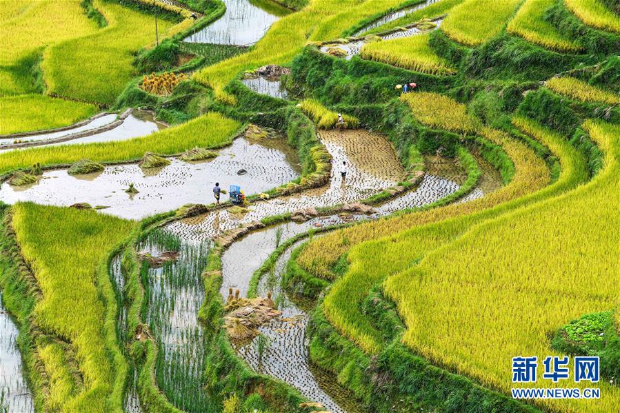 9月19日,从江县加榜乡党扭村的农民在收割稻谷。 近日,位于月亮山区的贵州省从江县加榜梯田种植的水稻迎来收获季节,当地农民抓住秋雨停歇时机收割、搬运、晾晒稻谷。 新华社记者 杨文斌 摄