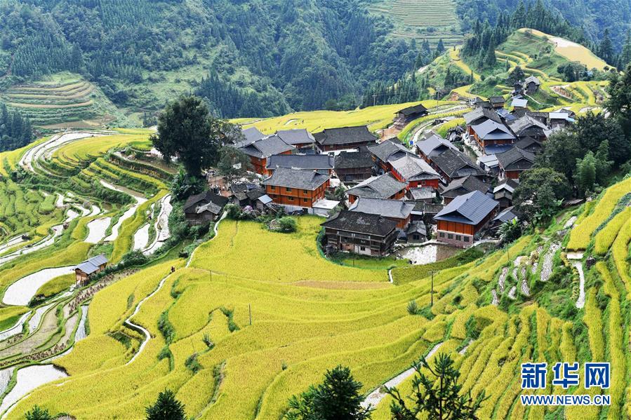 这是从江县加榜梯田待收割的稻谷(9月19日摄)。 近日,位于月亮山区的贵州省从江县加榜梯田种植的水稻迎来收获季节,当地农民抓住秋雨停歇时机收割、搬运、晾晒稻谷。 新华社记者 杨文斌 摄