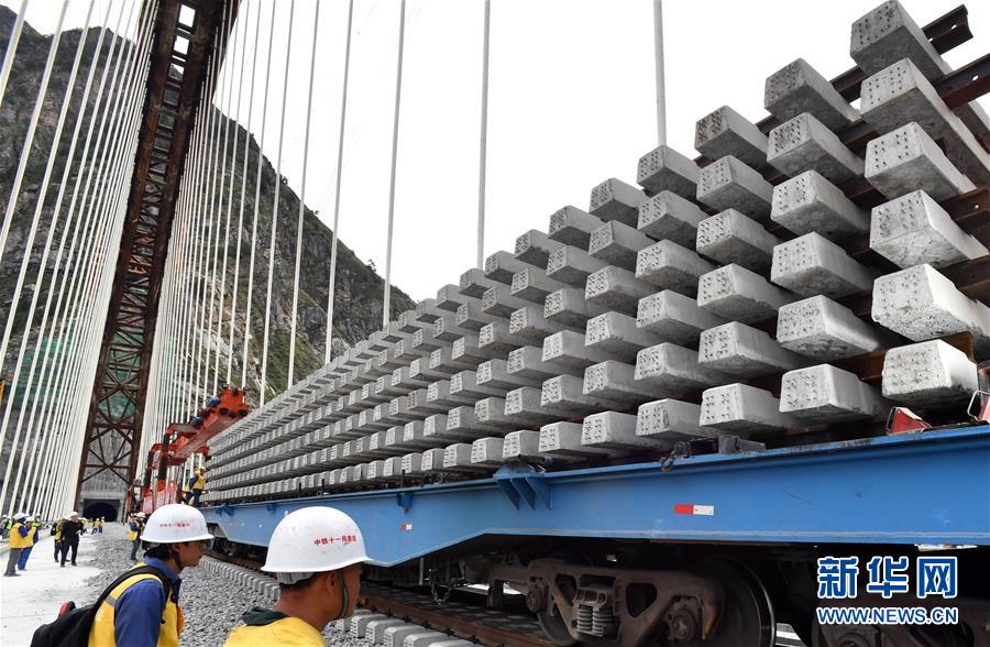 9月20日,中铁十一局工程技术人员在藏木特大桥上铺轨。 当日,伴随着阵阵轰鸣声,铺轨机吊着一排25米长的轨排,缓缓落在藏木雅鲁藏布江特大桥上,标志着拉萨至林芝铁路第三座跨越雅鲁藏布江特大桥已经铺轨,至此正线铺轨168公里,距离2021年建成通车更近了一步。 藏木特大桥位于西藏山南市加查县境内,全长525.1米,主拱跨径430米,横跨雅鲁藏布江。 拉萨至林芝铁路是国家“十三五”规划重点工程项目,全长435公里,设计时速160公里,是西藏首条电气化铁路,全线16次跨越雅鲁藏布江,地质条件复杂,桥隧比高达75%。 新华社记者 觉果 摄