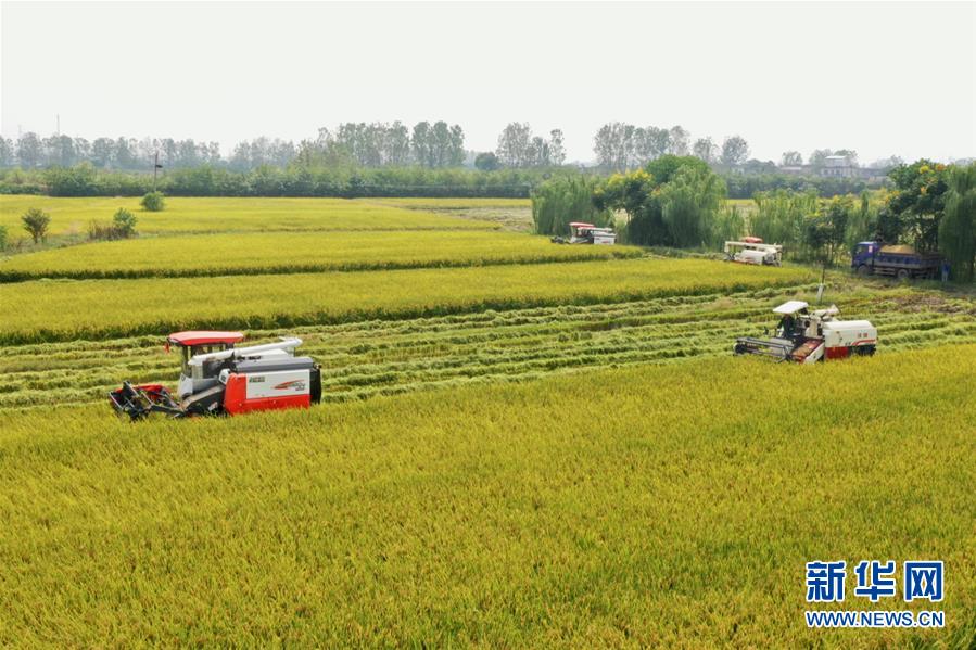 9月20日,农机手操作收割机在稻田里进行收割作业(无人机照片)。 临近秋分节气,位于巢湖岸边的安徽省肥东县店埠镇的王军民家庭农场,尽管1500亩水稻在汛期受到了降雨影响,但由于排水及时、田管科学,仍取得了不错的收成。眼下,农场的农机手正抢抓有利天气,力争让稻谷颗粒归仓。 新华社记者 汤阳 摄