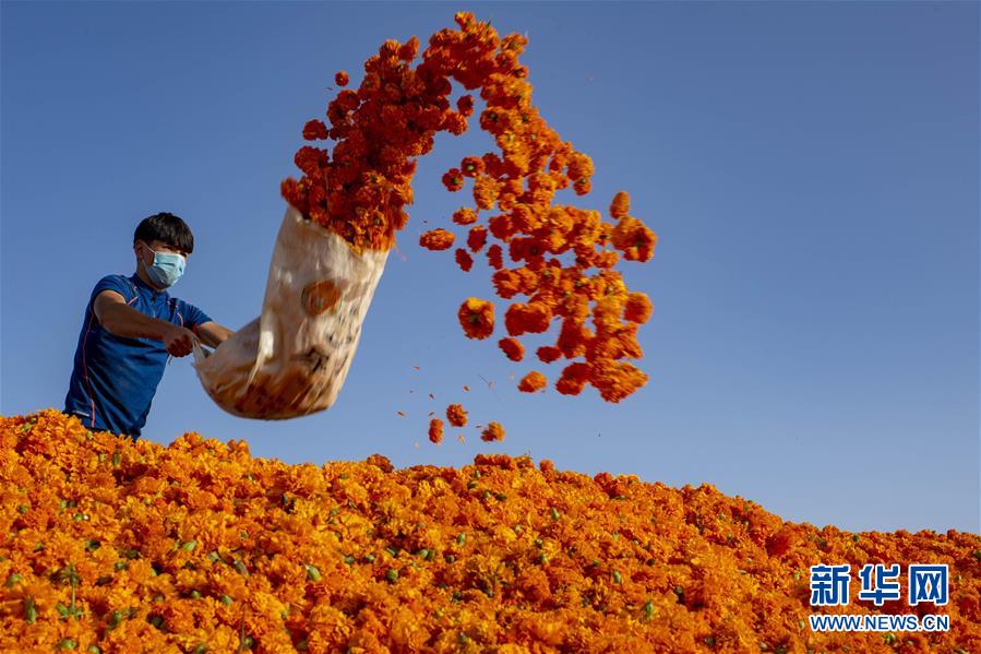 在新疆于田县托格日尕孜乡农业产业园内,一位村民将称重后的万寿菊倒入发酵池(9月20日摄)。新华社记者 胡虎虎 摄
