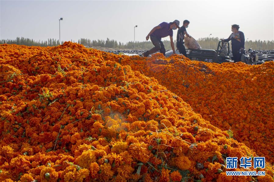 在新疆于田县托格日尕孜乡农业产业园内,农户将采收后的万寿菊卖给一家生物科技企业(9月20日摄)。新华社记者 胡虎虎 摄