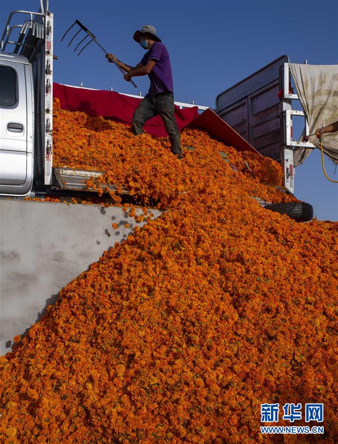 新疆于田县的农民将万寿菊集中运来卖给一家生物科技企业(9月20日摄)。新华社记者 胡虎虎 摄