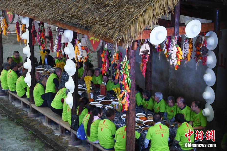 9月21日,重庆璧山七塘镇幺滩院子内热闹喜庆,当地村民齐聚于此吃长桌宴,喜迎2020中国农民丰收节。当日,由重庆市璧山区农业农村委员会主办、璧山区七塘镇协办的“精准扶贫结硕果、田园璧山庆丰收”2020年中国农民丰收节璧山庆祝活动在幺滩院子拉开帷幕,让辛劳了一年的当地村民沉浸在丰收的快乐之中。图为村民正在一同吃长桌宴。 陈超 摄