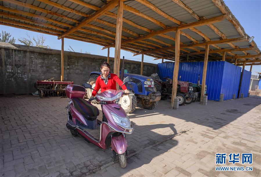 9月21日,在新疆喀什地区疏附县托克扎克镇阿亚格曼干村,村民阿依谢姆古丽·艾则孜准备骑上电瓶车外出。 近年来,位于新疆喀什地区疏附县的托克扎克镇阿亚格曼干村利用城郊村地缘优势,通过调整产业结构促进群众增收。目前,阿亚格曼干村已发展出笤帚制作、设施农业、特色林果业、花卉苗木种植等产业,2019年全村1067户5121人人均收入过万元。 新华社记者 赵戈 摄