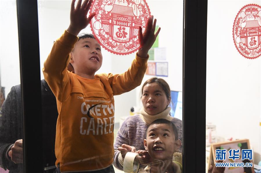 兴业县搬迁群众胡红君(女)与家人一起贴“福”(1月20日摄)。 广西是全国脱贫攻坚主战场之一。2015年以来,广西举全自治区之力,创新性开展工作,加快贫困地区交通基础设施建设,让大山里的贫困群众告别“出行难”;开展饮水工程建设,让每一个村民喝上“放心水”;积极推进易地扶贫搬迁工程,将约71万贫困人口从“一方水土养不好一方人”的地方搬出;大力提升贫困学生教育保障水平和贫困地区教育发展质量;大力发展扶贫产业,积极推进就业扶贫工作,以稳就业促脱贫。经过几年的努力,广西贫困地区生产生活条件得到明显改善,社会经济发展日新月异,各族群众一起迈向幸福新生活。 新华社记者 曹祎铭 摄