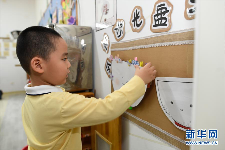 9月22日,湖州童星幼儿园大班的孩子吃完午餐后将个人名字放置在“光盘行动墙”上。 当日,浙江湖州童星幼儿园在吴兴区爱山街道红丰西塘社区园区的大班开展“光盘行动 从我做起”主题教育活动,倡导珍惜粮食,让幼儿从小养成节俭的习惯。 新华社记者 黄宗治 摄