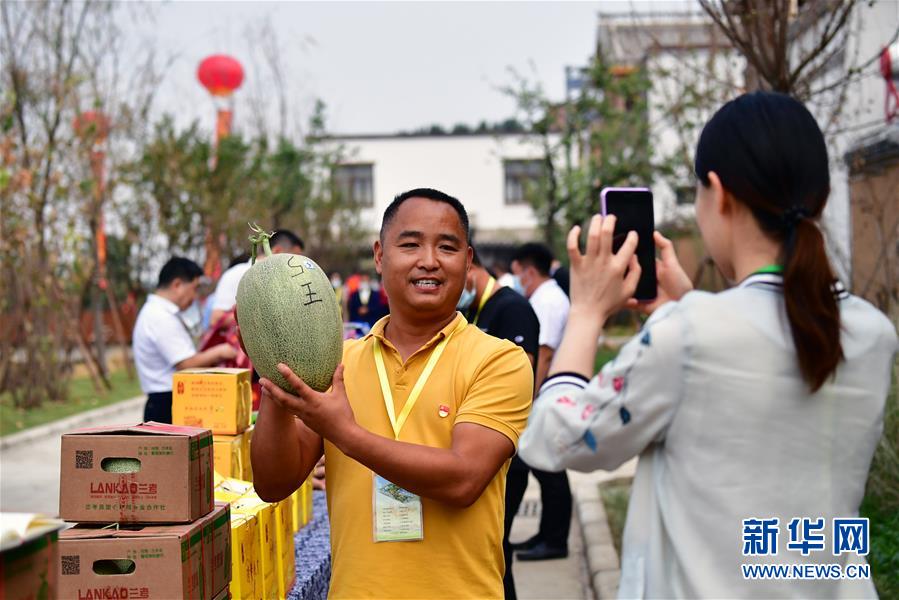 9月22日,在河南省开封市祥符区西姜寨村,瓜农在“晒丰收”活动现场展示兰考蜜瓜。 当日是2020年中国农民丰收节,河南省主会场活动在开封市祥符区西姜寨村举行。 新华社记者 冯大鹏 摄