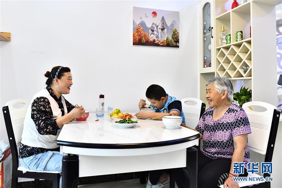 9月22日,在鄄城县董口镇黄河社区,刘月娥一家在吃午饭。 新华社记者 郭绪雷 摄