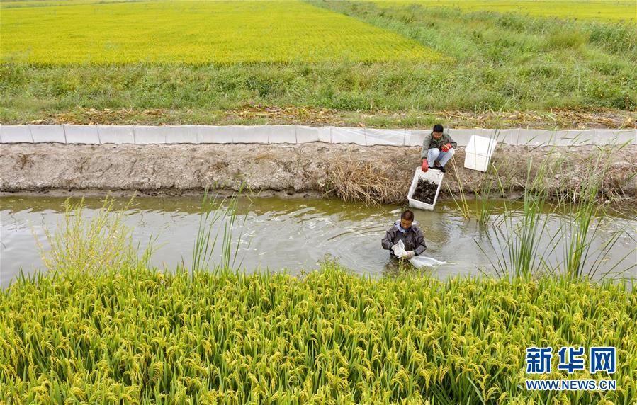 9月22日,河北省唐山市芦台经济开发区海北镇岭头村农民在稻田内收获河蟹(无人机照片)。 近年来,河北唐山芦台经济开发区依托农业龙头企业,在发展有机水稻种植的同时,在稻田内养殖河蟹,利用水稻与河蟹的生态关系,减少水稻农业喷洒和河蟹饲料喂食,提高农民经济收益的同时改善生态环境。目前,芦台经济开发区有机稻田养蟹已经发展上万亩,每亩年增收1000余元。 新华社记者 牟宇 摄