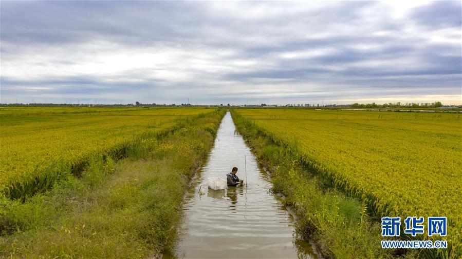 9月22日,河北省唐山市芦台经济开发区海北镇岭头村农民在稻田内收获河蟹(无人机照片)。 近年来,河北唐山芦台经济开发区依托农业龙头企业,在发展有机水稻种植的同时,在稻田内养殖河蟹,利用水稻与河蟹的生态关系,减少水稻农业喷洒和河蟹饲料喂食,提高农民经济收益的同时改善生态环境。目前,芦台经济开发区有机稻田养蟹已经发展上万亩,每亩年增收1000余元。 新华社记者 牟宇 摄