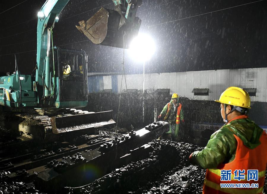 9月22日晚,中铁二十四局施工人员在冒雨施工。 9月23日凌晨,由中铁二十四局负责施工的安徽合肥涡阳路下穿淮南、合武绕行线立交工程涉铁项目顺利完成既有道岔拆除、新道岔铺设及线路拨接等工序。600余名施工人员深夜冒雨施工,确保重点工程建设进度。 新华社记者 刘军喜 摄