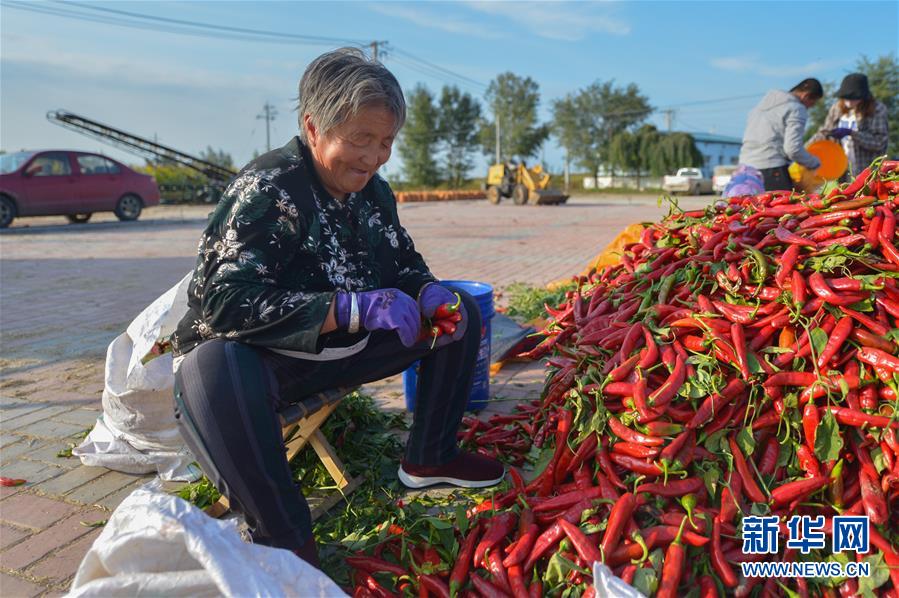 9月24日,农民在兴安盟突泉县突泉镇永宝村海波种植养殖专业合作社挑选辣椒。 金秋时节,在内蒙古兴安盟突泉县,农民们忙碌在田间地头,一派丰收景象。 新华社记者 徐钦 摄