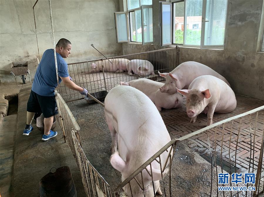 8月6日,内蒙古自治区兴安盟乌兰浩特市乌兰哈达镇白音特布斯格嘎查农民蒋鹏在自家猪圈里铲猪粪。新华社记者 安路蒙 摄