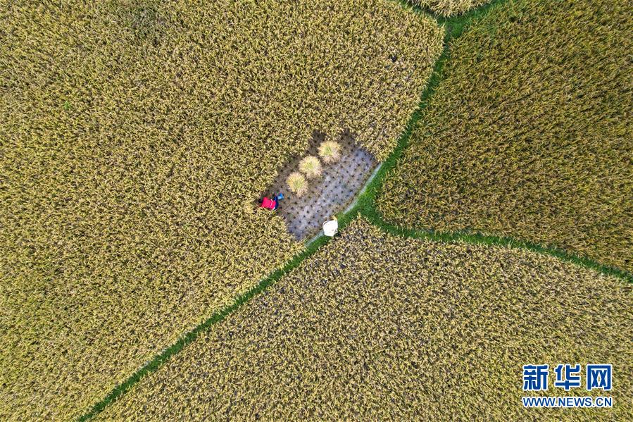 9月24日,贵州省毕节市黔西县洪水镇解放村村民抢收稻谷(无人机照片)。 金秋时节,贵州省毕节市黔西县水稻进入收获季,村民抢收水稻的同时也捕捞稻田鱼。近年来,黔西县大力推广水稻种植良种良法,提升水稻产量和品质,并引导农民科学配套发展稻田养鱼、养虾、养蛙等生态立体农业产业,有效改善土壤生态,助农增产增收。 新华社发(史开心 摄)