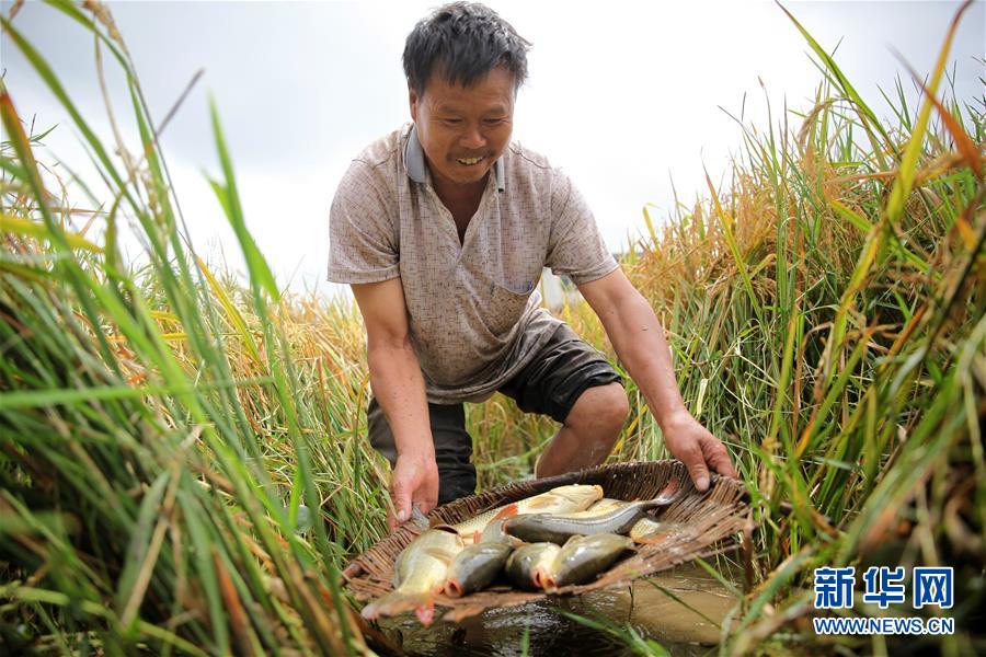 9月24日,贵州省毕节市黔西县洪水镇解放村村民收获稻田鱼。 金秋时节,贵州省毕节市黔西县水稻进入收获季,村民抢收水稻的同时也捕捞稻田鱼。近年来,黔西县大力推广水稻种植良种良法,提升水稻产量和品质,并引导农民科学配套发展稻田养鱼、养虾、养蛙等生态立体农业产业,有效改善土壤生态,助农增产增收。 新华社发(史开心 摄)