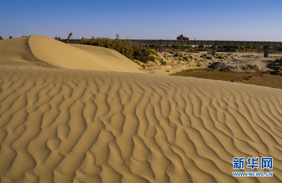 9月25日,施工人员和机械在新疆和若铁路策勒河2号桥上进行施工作业。 近日,新疆和田至若羌铁路施工现场一片繁忙,铺轨、路基护坡、架梁等各项建设稳步推进。 和若铁路线路全长约825公里,是塔里木盆地铁路环线的重要组成部分,于2020年5月正式开始铺轨。 工程完工后,新疆洛浦、策勒、于田、民丰、且末等地将结束不通火车的历史,和田群众出疆路程将缩短1000多公里,有利于推动南疆地区经济社会加快发展。 新华社记者 胡虎虎 摄