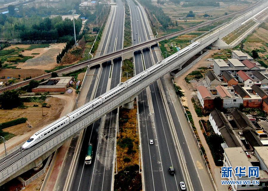 9月26日,D55602次综合检测列车行驶在焦作车站附近的线路上(无人机照片)。 当日,随着D55602次综合检测列车从焦作车站驶出,新建太(原)焦(作)铁路郑州局管段正式开始联调联试动态检测,标志着该铁路进入开通运营倒计时。 新华社记者 李安 摄