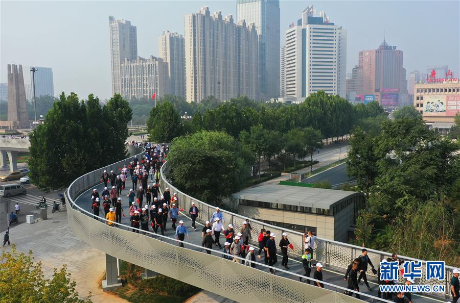 9月26日,参加唐山市城市慢行绿色景观通道启用仪式的社会各界代表在时代广场段体验慢行绿色景观通道(无人机照片)。 当日,河北省唐山市超级绿道项目——城市慢行绿色景观通道正式启用。据介绍,整个绿道全长10.5公里,以高架桥梁贯穿唐山东湖花海、陡河、抗震纪念碑广场、南湖等多处景点和城市公园绿地,是融生态修复、休闲运动、文化宣传等功能于一体的综合型城市慢行绿色景观通道。 新华社记者 杨世尧 摄
