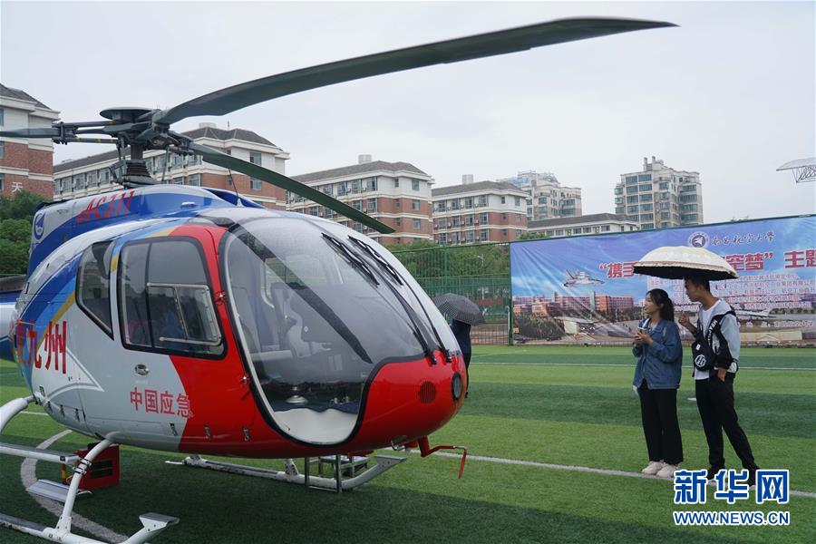 9月26日,两位学生近距离观看国产直升机。 当日,江西南昌航空大学举行招聘会,除了传统的招聘形式外,中国商用飞机有限责任公司南昌基地、航空工业江西洪都航空工业集团有限责任公司、中国航空工业昌河飞机工业(集团)有限责任公司等航空企业还联合举办“携手共筑江西航空梦”活动,将国产AC311A和AC311民用直升机飞到校园内,让同学们能够近距离接触、体验国产民用直升机,也借此吸引更多人才投身航空事业。 新华社记者 周密 摄