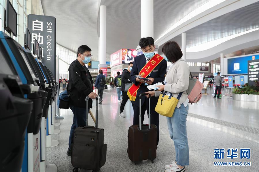 9月27日,在兰州中川国际机场,志愿者向旅客发放疫情防控宣传册。 国庆中秋假期前夕,兰州中川国际机场针对疫情防控常态化要求,提升服务标准,为旅客提供包括如何申请健康码、机场和机上注意事项、紧急情况处置办法等内容的咨询服务,助旅客安全出行。 新华社记者 马希平 摄