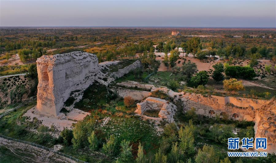 夕阳下的统万城西南角城台遗址(9月24日摄,无人机照片)。