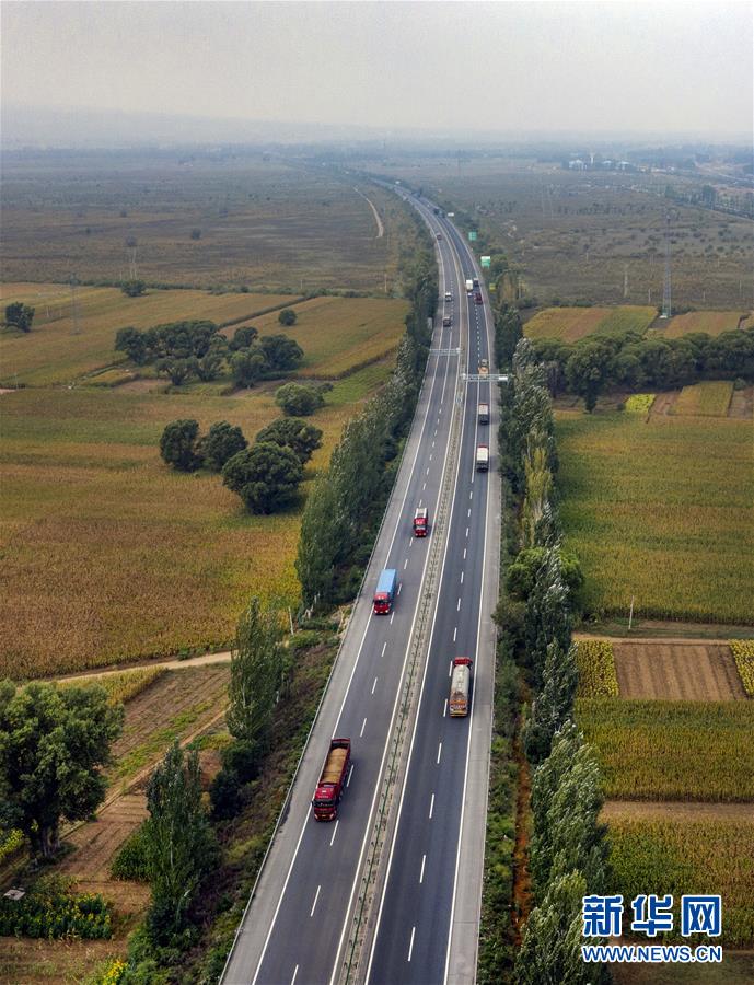 车辆行驶在榆(林)靖(边)高速公路上(9月27日摄,无人机照片)。 新华社记者 陶明 摄
