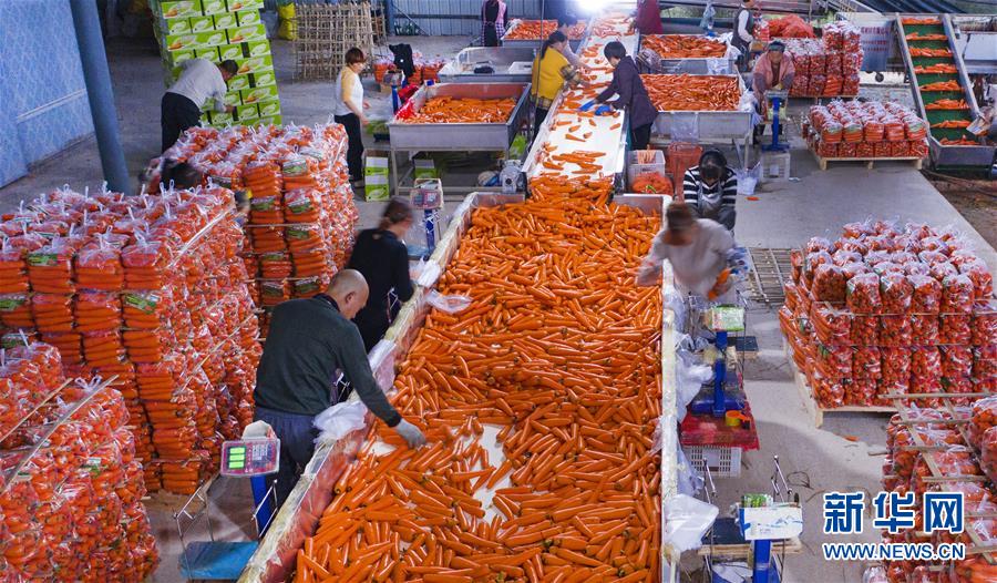 9月25日,靖边县东坑镇宏晨种养殖农民专业合作社群众在分拣红萝卜。新华社记者 陶明 摄