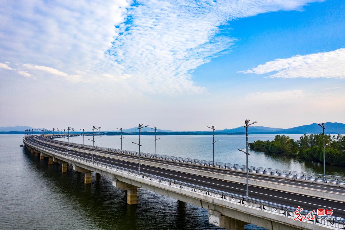 2020年9月28日,位于江西省九江市都昌县境内的新妙湖特大桥建成通车。新妙湖特大桥是省道S214都昌境内多宝至县城段升级改造工程重点建设项目之一,建成后将改善当地交通区域现状,带动鄱阳湖旅游发展。(傅建斌摄/光明图片)
