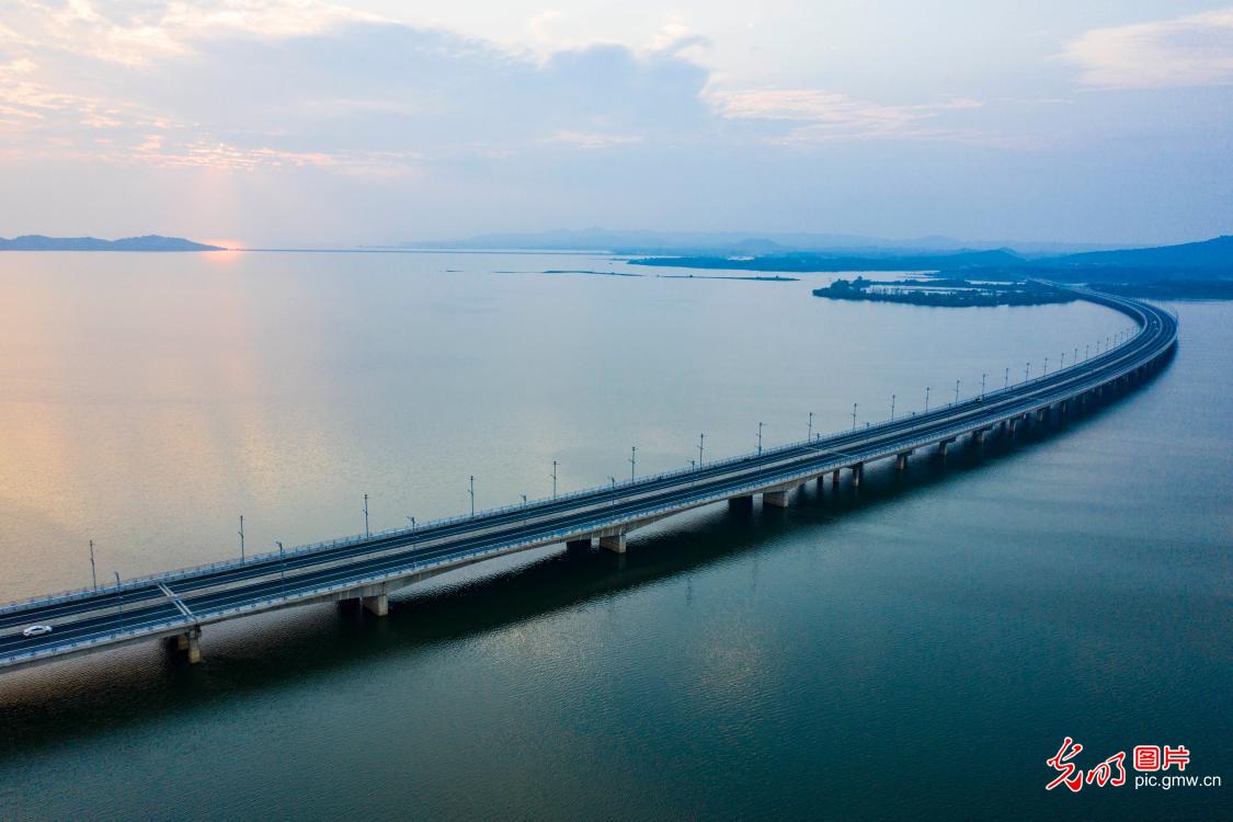 2020年9月28日,位于江西省九江市都昌县境内的新妙湖特大桥建成通车。新妙湖特大桥是省道S214都昌境内多宝至县城段升级改造工程重点建设项目之一,建成后将改善当地交通区域现状,带动鄱阳湖旅游发展。(傅建斌摄/光明图片)