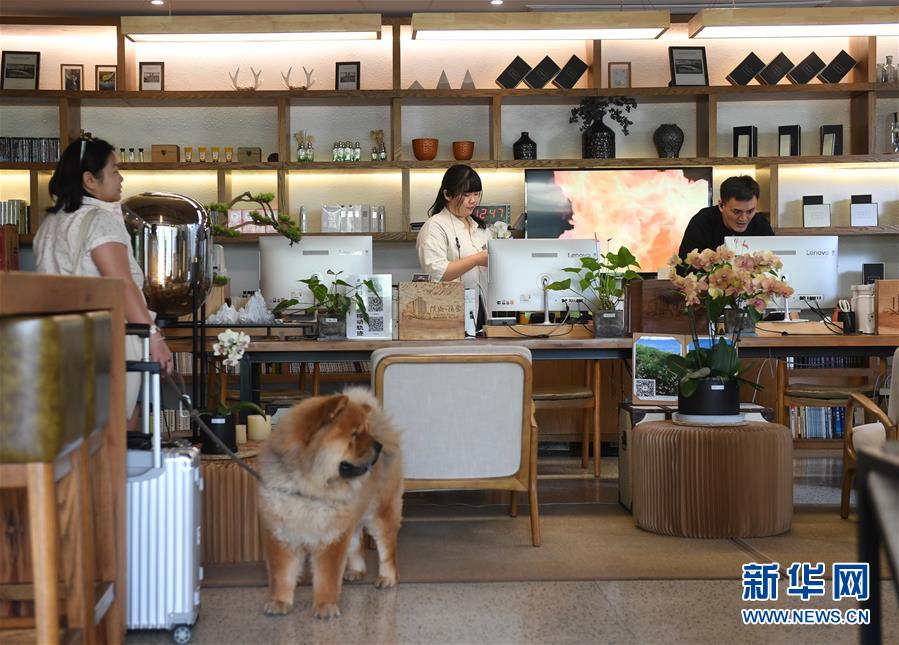 在计家墩理想村,鲁刚刚(右一)和同事们在溪地清舍民宿大堂忙碌(9月27日摄)。来自山东临沂的鲁刚刚是溪地清舍民宿的“大管家”。学习酒店管理的他大学毕业后,先后在北京、上海的酒店工作。2019年,鲁刚刚通过朋友介绍来到理想村,成为这里的一名“新村民”。从乡村来到大城市,又从城市回到乡村,他最大的感受是这里统一规划、统一风格,将建筑设施与农村风貌相融合,既有大城市的便捷设施,又保留了乡村的自然舒适。新华社记者 季春鹏 摄