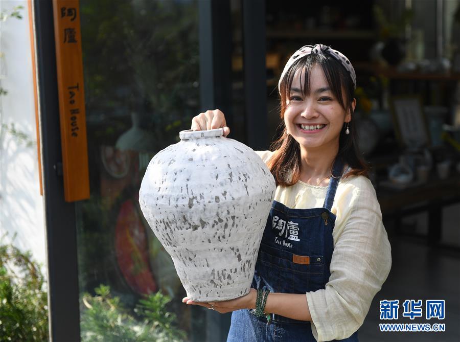 在计家墩理想村,汪涛展示自己制作的陶器作品(9月27日摄)。“陶庐慢生活艺术空间”的店主汪涛来自成都,之前在成都、上海从事媒体工作,为了让孩子能够更好的接触大自然,她来到理想村创建了“陶庐”。汪涛说:“在这里,每天打开窗户可以看到小河,听到鹅鸣,闻到花香,感觉生活的节奏慢了下来,孩子们在这样的环境里成长,我在这样的环境里工作生活,真的是将理想照进了现实。” 新华社记者 季春鹏 摄