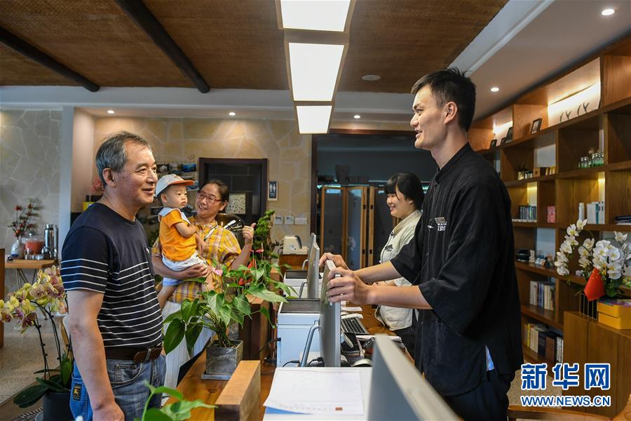 在计家墩理想村,鲁刚刚(右一)在溪地清舍民宿内为旅客服务(9月27日摄)。来自山东临沂的鲁刚刚是溪地清舍民宿的“大管家”。学习酒店管理的他大学毕业后,先后在北京、上海的酒店工作。2019年,鲁刚刚通过朋友介绍来到理想村,成为这里的一名“新村民”。从乡村来到大城市,又从城市回到乡村,他最大的感受是这里统一规划、统一风格,将建筑设施与农村风貌相融合,既有大城市的便捷设施,又保留了乡村的自然舒适。新华社记者 李博 摄
