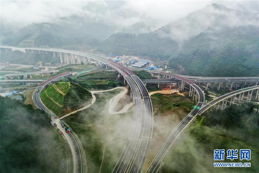 这是10月1日拍摄的贵州剑榕高速岑松互通(无人机照片)。 10月1日,由中交一公局集团有限公司承建的贵州剑(河)榕(江)高速公路开通试运营,实现全线通车。剑榕高速公路跨越三穗、剑河、榕江三个县,全长约118公里。 新华社记者 杨文斌 摄