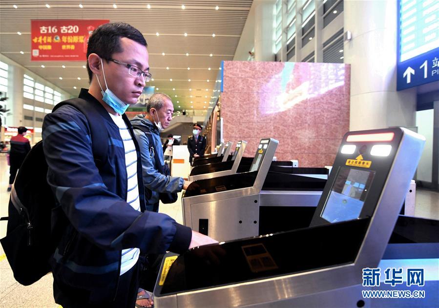 9月29日,孟杰在廊坊火车站进站通道“刷脸”验票。 新华社记者 王晓 摄