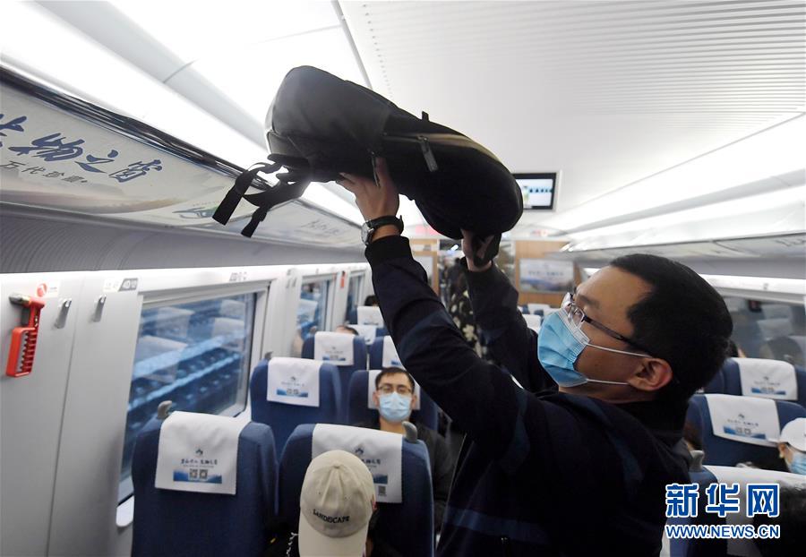 9月29日,孟杰在G7802次列车车厢内摆放书包。 新华社记者 王晓 摄