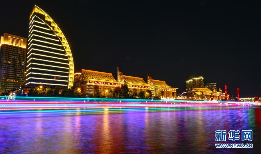 10月2日拍摄的天津古文化街码头一带夜景。 国庆、中秋“双节”期间,天津海河夜景灯光璀璨。 新华社发 (孙凡越 摄)