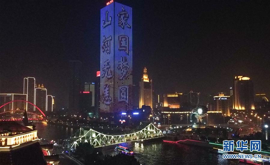 10月2日拍摄的天津解放桥一带夜景(无人机照片)。 国庆、中秋“双节”期间,天津海河夜景灯光璀璨。 新华社发 (孙凡越 摄)
