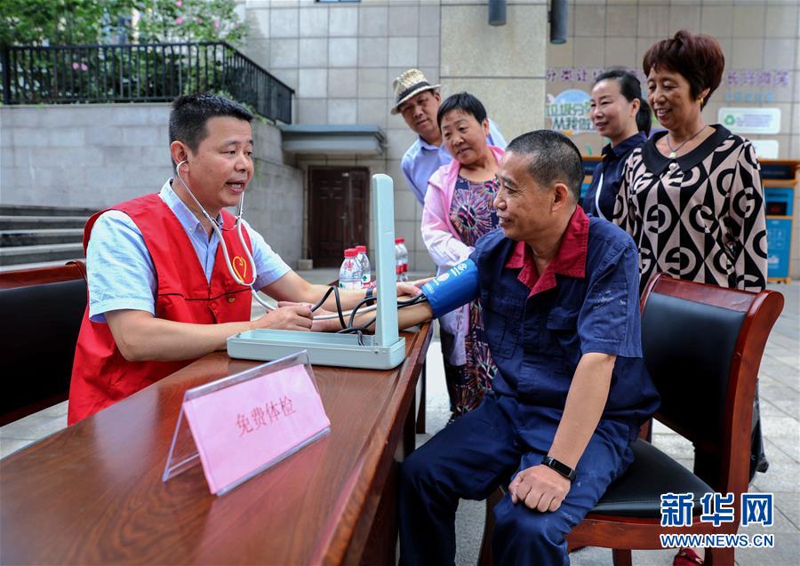 10月6日,太湖街道“红色志愿团”成员为社区百姓进行基础体检。 中秋和国庆假期期间,浙江省湖州市长兴县太湖街道开展“红色志愿服务在身边”活动,引导街道内各行各业的党员志愿者组建基层治理“红色志愿团”,为群众开展各类便民志愿服务。 新华社记者 徐昱 摄