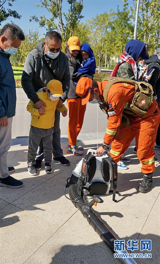 10月6日,消防员在北京世园公园为游人展示森林灭火装备 。 从10月1日起到10月8日,驻守在北京延庆区的应急管理部森林消防局机动支队特勤三中队,在延庆区北京世园公园、玉渡山景区、冬奥会延庆赛区等游人集中的森林景区开展“守护森林、保护环境”专项宣传活动。消防员们展示新型森林灭火装备50余套,为游人讲解森林防火知识、野外火灾逃生知识和森林灭火常识。 新华社记者 李欣 摄